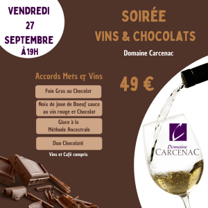 Soirée Vins & Chocolats au Domaine CARCENAC, le vendredi 27 septembre.